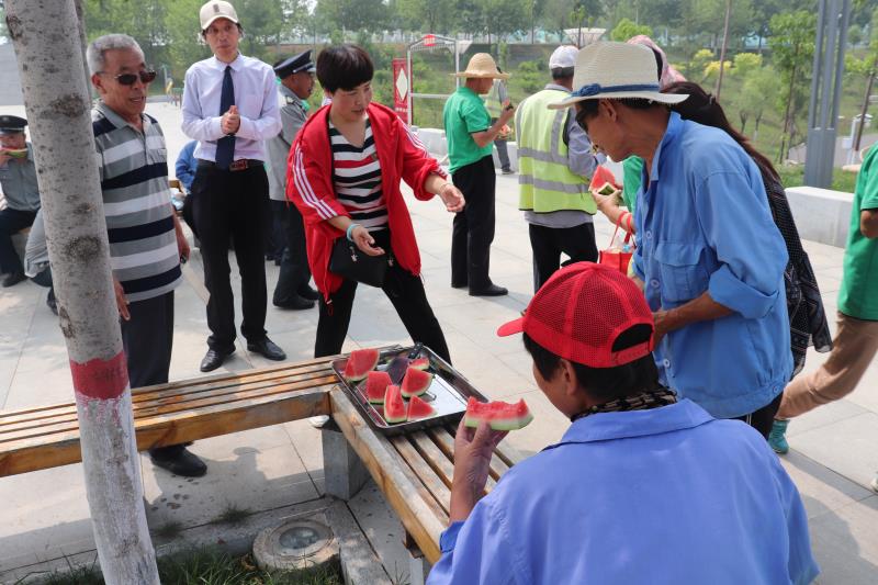 在公園的小廣場(chǎng),慰問(wèn)小組工作人員為員工切好西瓜,把西瓜、面包、白糖依次遞到員工手中,員工們親切的笑聲與慰問(wèn)人員的互動(dòng)形成了親情、溫情的交織,一片生動(dòng)和諧的場(chǎng)面。雖然是一個(gè)個(gè)面包,一塊塊西瓜、一袋袋白糖,卻使員工永遠(yuǎn)記住了這美好時(shí)光。崔主席也親自為員工切起了西瓜,員工們品嘗著西瓜和面包,感受著領(lǐng)導(dǎo)的關(guān)懷,決心做好自己的本職工作,為晉城創(chuàng)建全國(guó)文明城市做出積極貢獻(xiàn)。