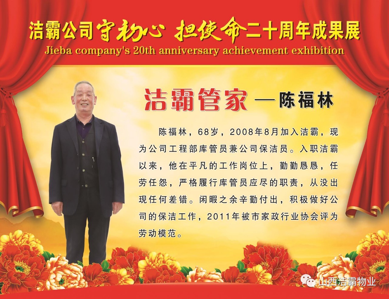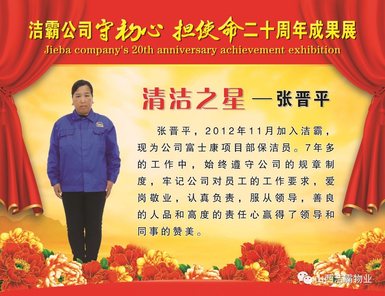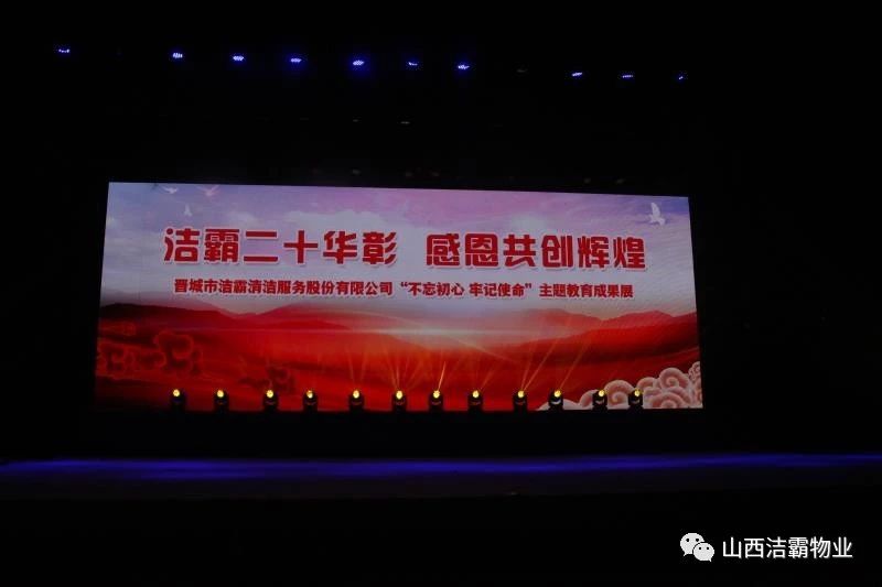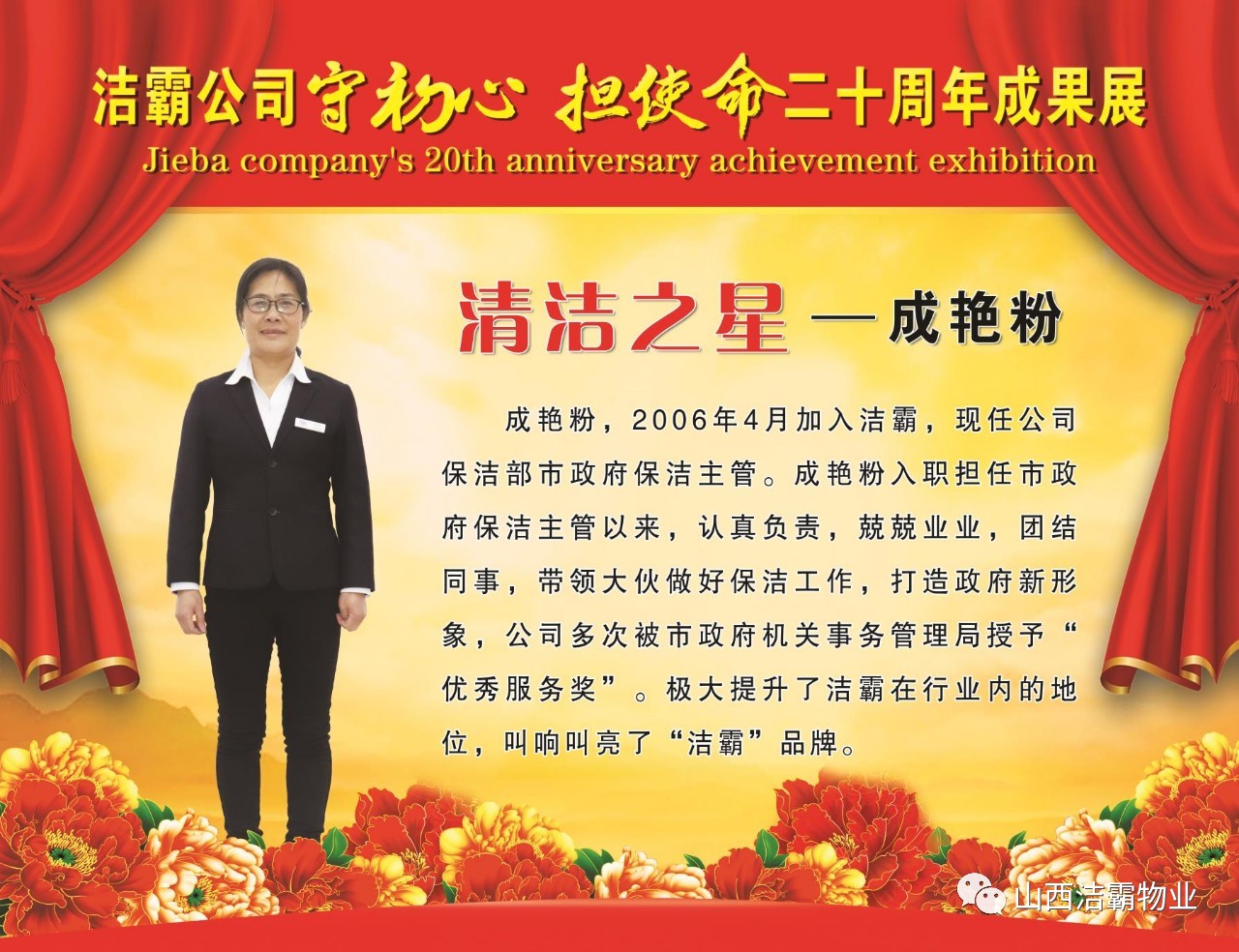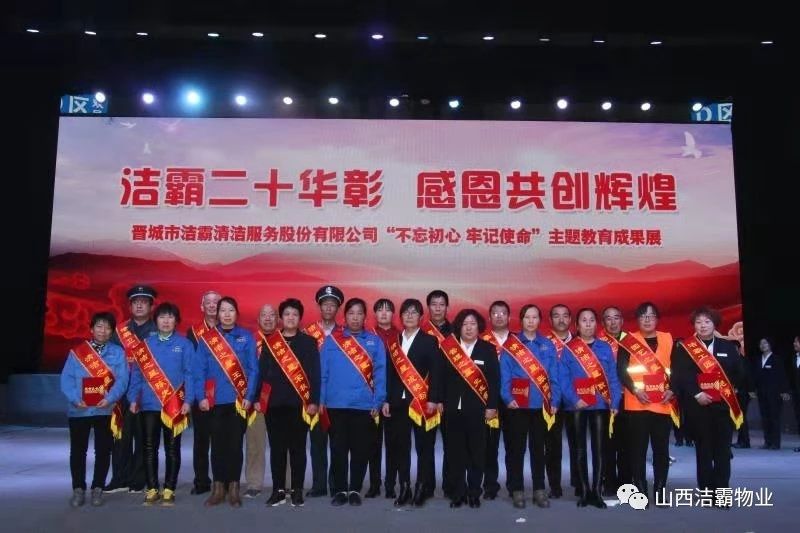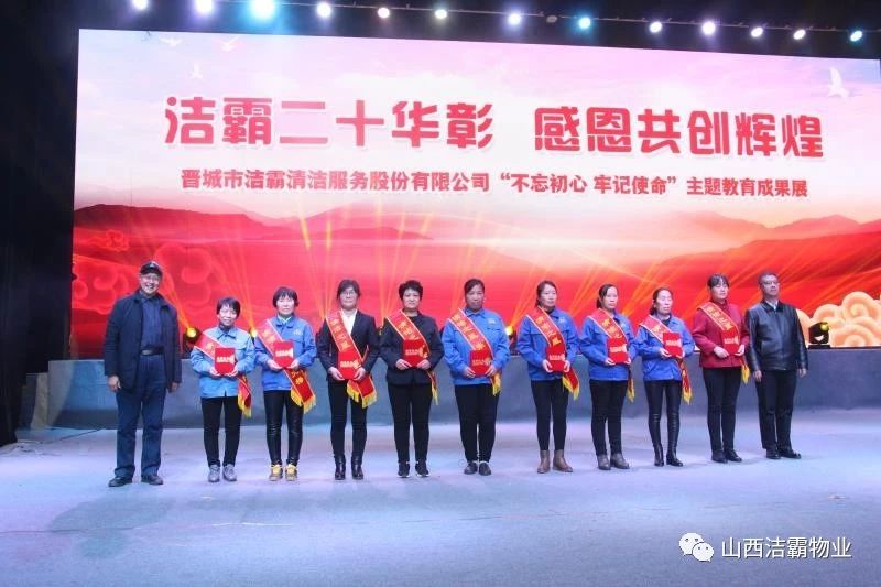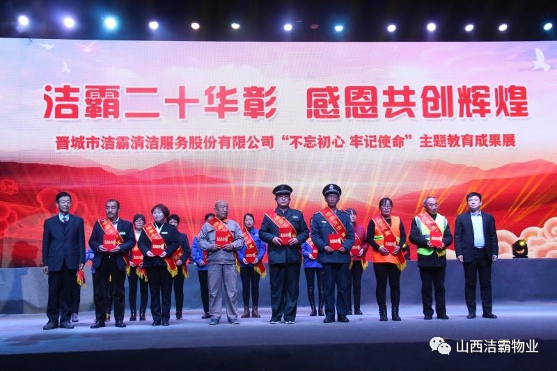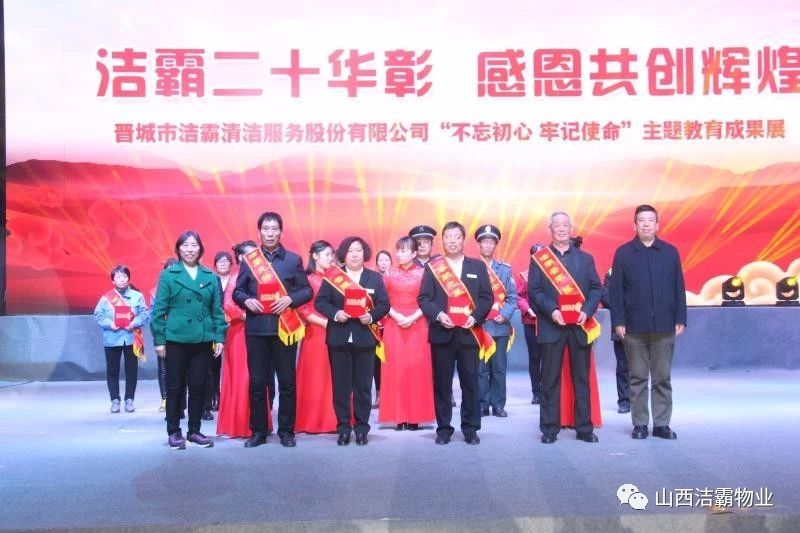 本次晚會以“潔霸二十華彰,感恩共創(chuàng)輝煌”為主題,此次慶典的核心思想是“感恩”,主要角色是潔霸的創(chuàng)業(yè)者。為此,公司對入職潔霸的創(chuàng)業(yè)功勛和一線員工進行了表彰獎勵。本次晚會共設8個獎項,包括“潔霸先鋒”“奉獻之星”“管理之星”“潔霸管家”“潔霸工匠”“清潔之星”“潔霸衛(wèi)士”“園藝之星”等。他們是:李山虎、張永智、史志霞、陳福林、王紅軍、余艷青、劉二丑、成艷粉、楊改梅、王書玲、張國榮、耿竹青、張粉霞、宋秋苗、陳先梅、張晉平、張偉山、趙瑞軍、王廣平、郭志云。晉城市原副市長成育廷、晉城市商務局原局長王新善、晉城市非公和社會組織工委書記郎軍芳、晉城市婦聯(lián)三級調(diào)研員李蓮菊、晉城市總工會商貿(mào)輕紡煙草服務業(yè)工會主席張玉濤、晉城市城區(qū)財政局局長翟明太等領(lǐng)導為他們頒獎。