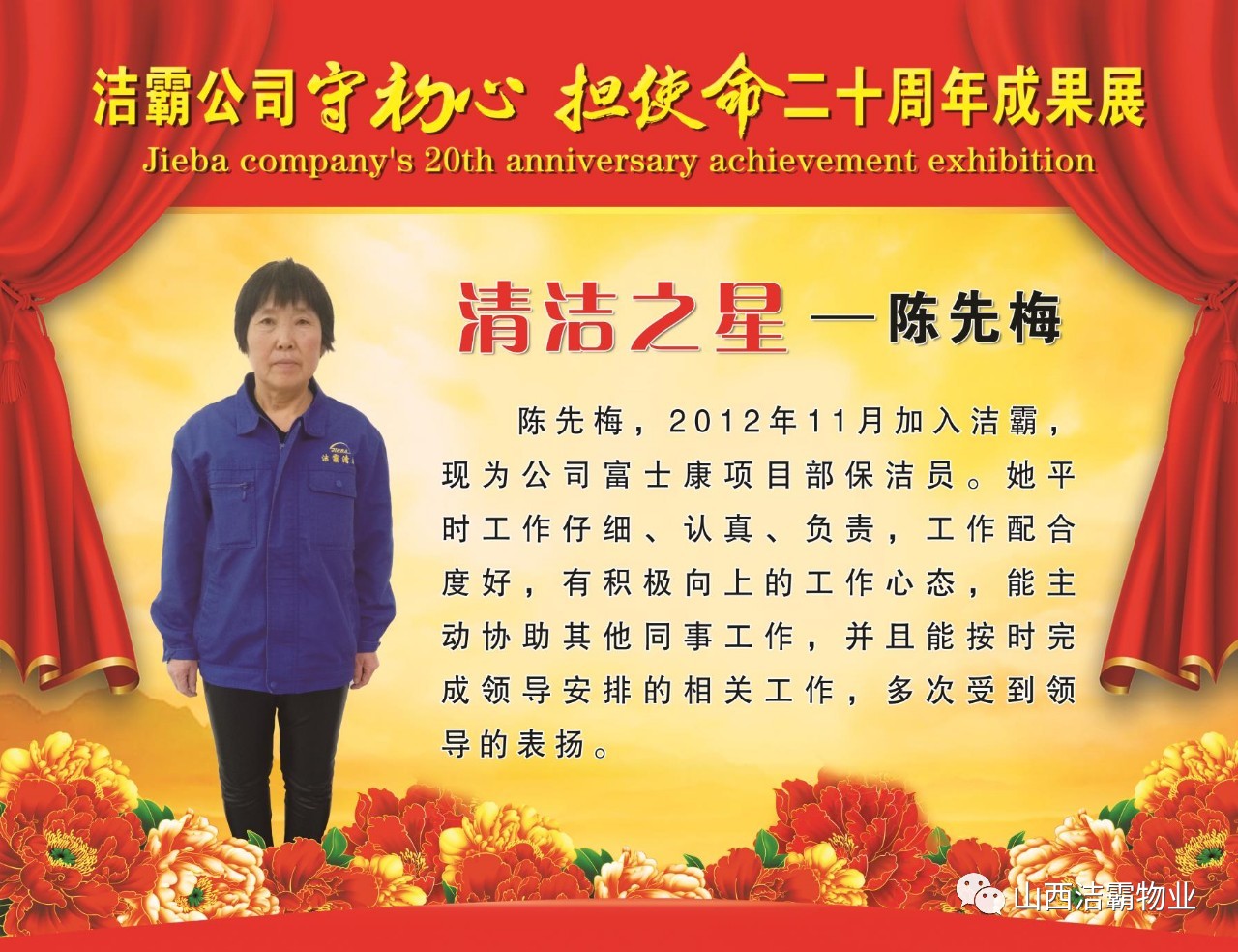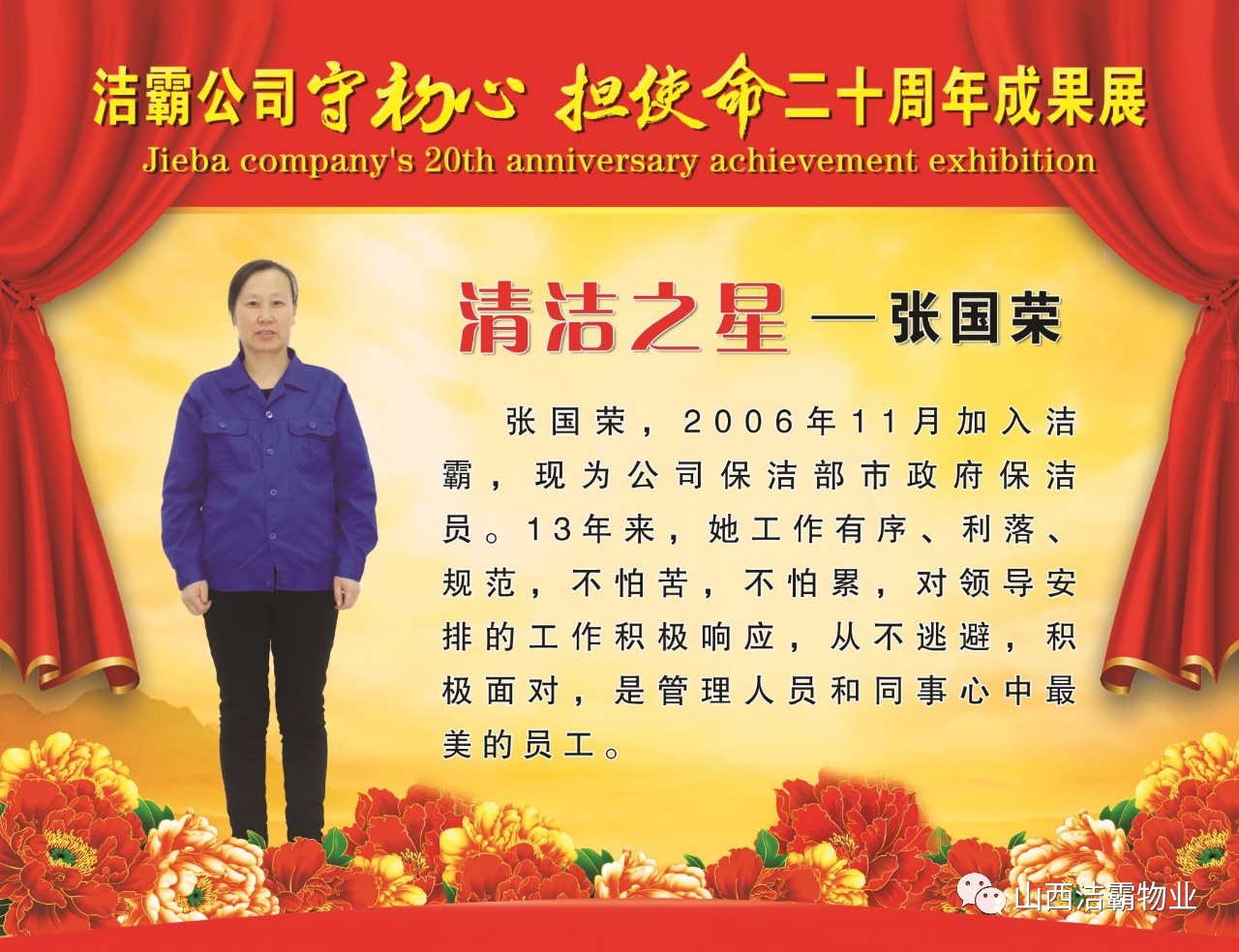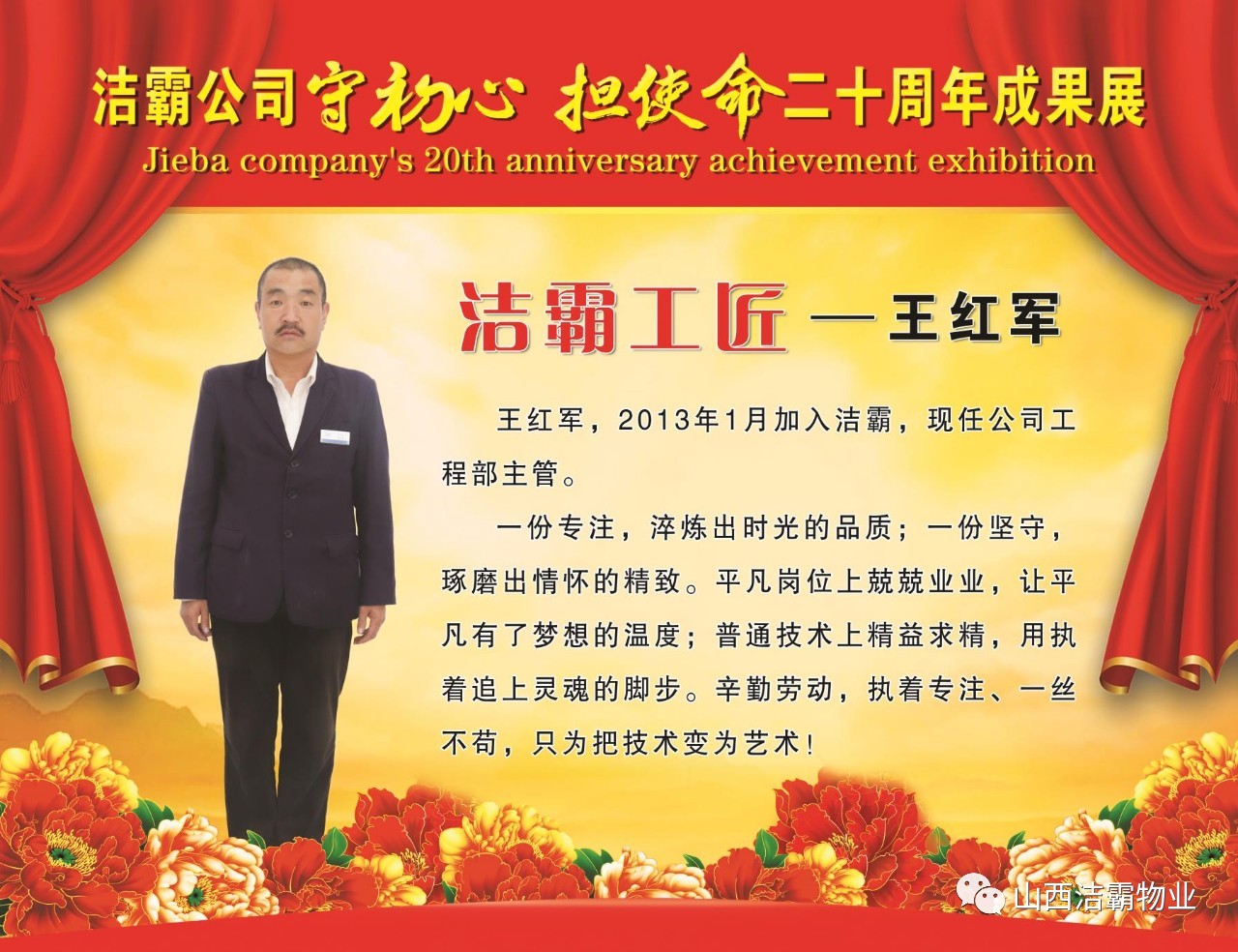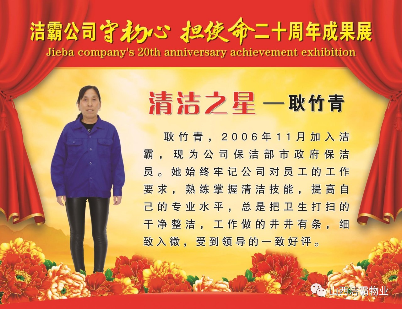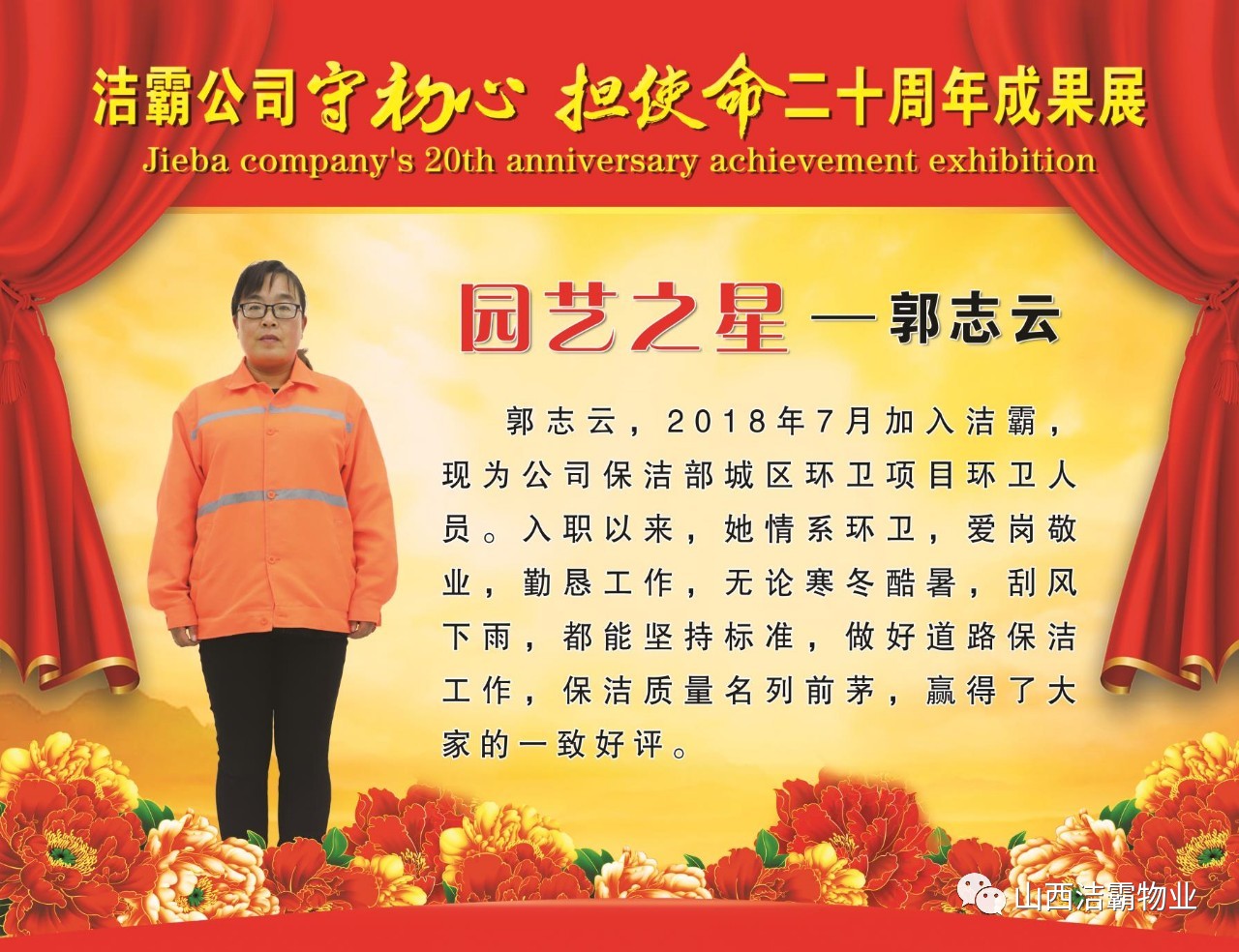 本次晚會以“潔霸二十華彰,感恩共創(chuàng)輝煌”為主題,此次慶典的核心思想是“感恩”,主要角色是潔霸的創(chuàng)業(yè)者。為此,公司對入職潔霸的創(chuàng)業(yè)功勛和一線員工進行了表彰獎勵。本次晚會共設8個獎項,包括“潔霸先鋒”“奉獻之星”“管理之星”“潔霸管家”“潔霸工匠”“清潔之星”“潔霸衛(wèi)士”“園藝之星”等。他們是:李山虎、張永智、史志霞、陳福林、王紅軍、余艷青、劉二丑、成艷粉、楊改梅、王書玲、張國榮、耿竹青、張粉霞、宋秋苗、陳先梅、張晉平、張偉山、趙瑞軍、王廣平、郭志云。晉城市原副市長成育廷、晉城市商務局原局長王新善、晉城市非公和社會組織工委書記郎軍芳、晉城市婦聯(lián)三級調(diào)研員李蓮菊、晉城市總工會商貿(mào)輕紡煙草服務業(yè)工會主席張玉濤、晉城市城區(qū)財政局局長翟明太等領(lǐng)導為他們頒獎。