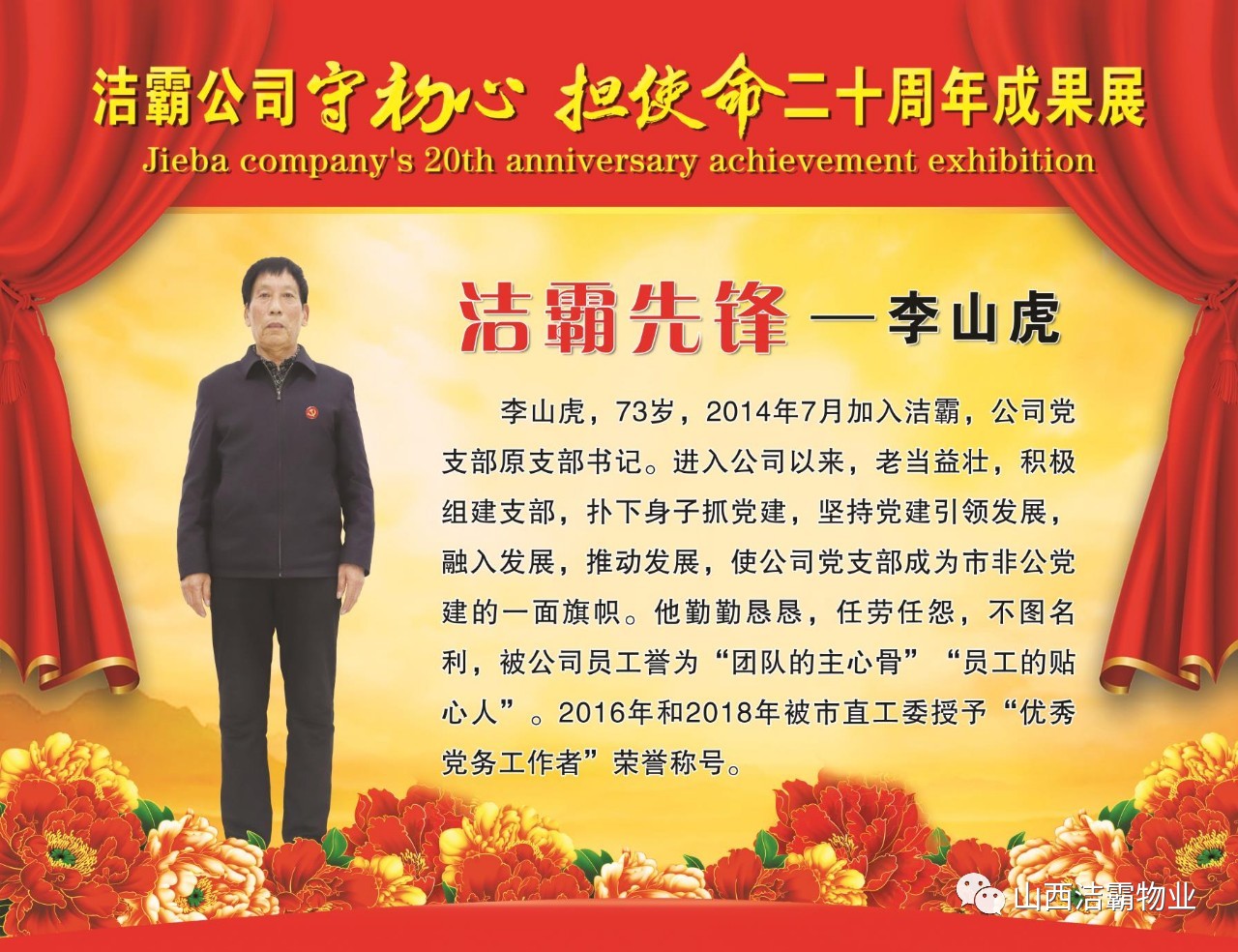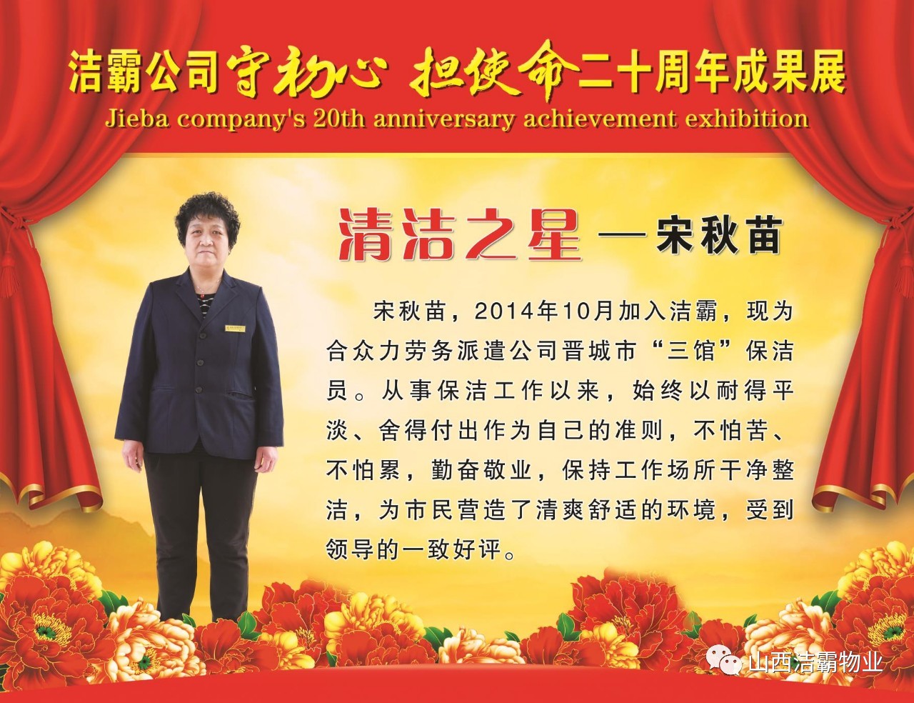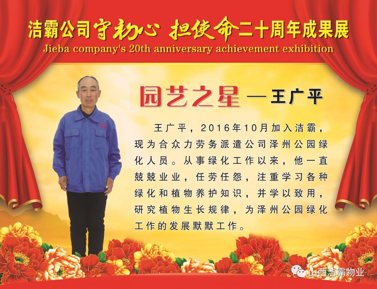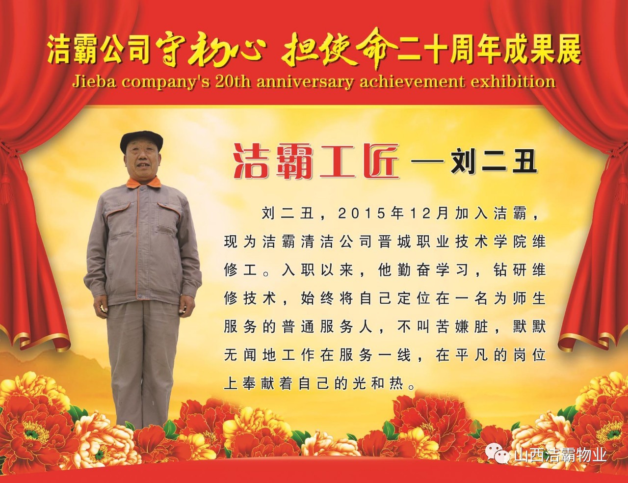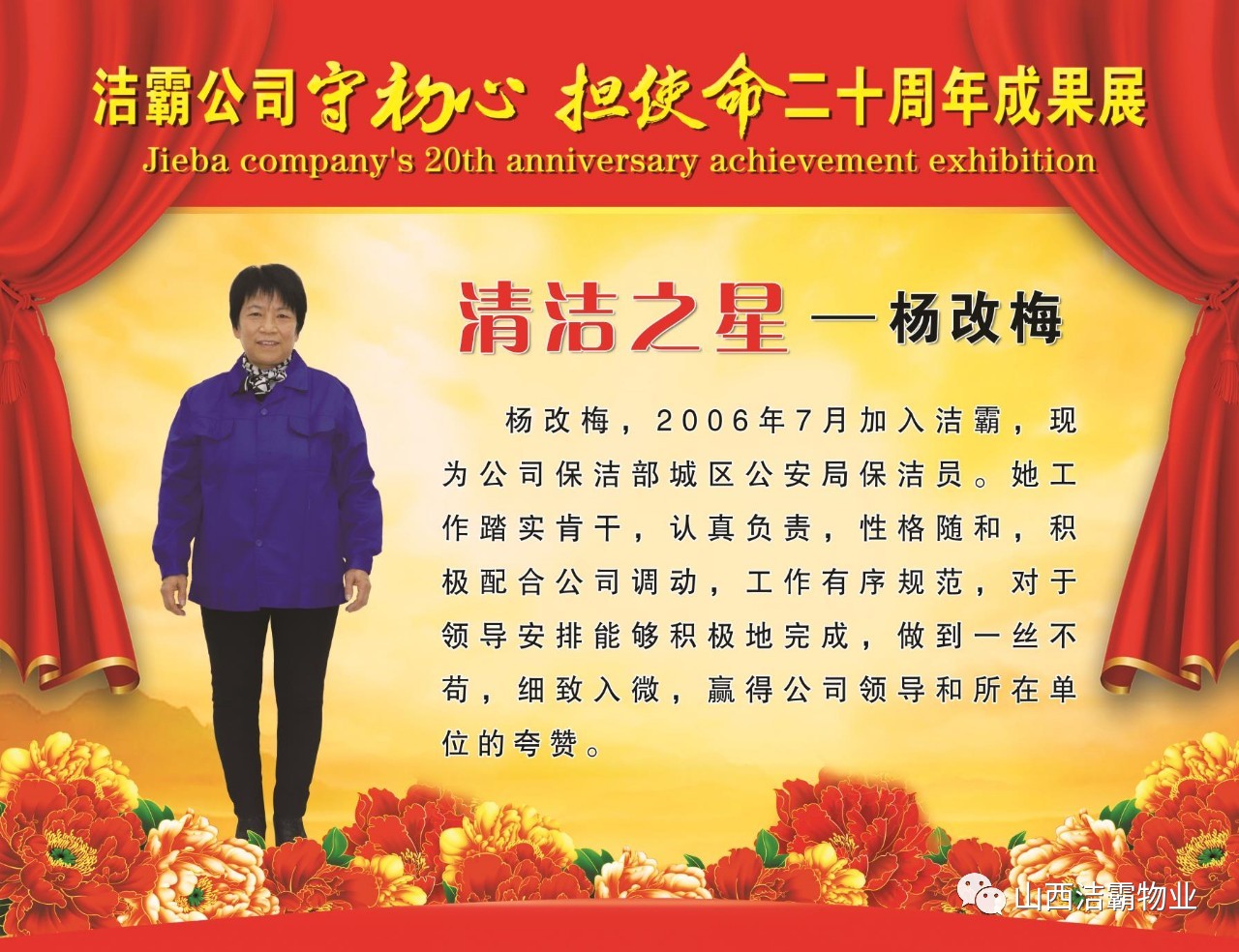 本次晚會以“潔霸二十華彰,感恩共創(chuàng)輝煌”為主題,此次慶典的核心思想是“感恩”,主要角色是潔霸的創(chuàng)業(yè)者。為此,公司對入職潔霸的創(chuàng)業(yè)功勛和一線員工進行了表彰獎勵。本次晚會共設8個獎項,包括“潔霸先鋒”“奉獻之星”“管理之星”“潔霸管家”“潔霸工匠”“清潔之星”“潔霸衛(wèi)士”“園藝之星”等。他們是:李山虎、張永智、史志霞、陳福林、王紅軍、余艷青、劉二丑、成艷粉、楊改梅、王書玲、張國榮、耿竹青、張粉霞、宋秋苗、陳先梅、張晉平、張偉山、趙瑞軍、王廣平、郭志云。晉城市原副市長成育廷、晉城市商務局原局長王新善、晉城市非公和社會組織工委書記郎軍芳、晉城市婦聯(lián)三級調(diào)研員李蓮菊、晉城市總工會商貿(mào)輕紡煙草服務業(yè)工會主席張玉濤、晉城市城區(qū)財政局局長翟明太等領(lǐng)導為他們頒獎。