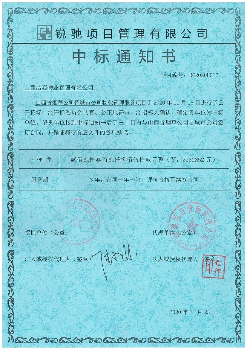 2020年11月18日,山西省煙草公司晉城公司物業(yè)管理服務(wù)項(xiàng)目開標(biāo)會(huì)議在晉城市文昌東街1560號(hào)南環(huán)供電營業(yè)站一樓東會(huì)議室舉行。在經(jīng)過幾個(gè)小時(shí)的激烈競標(biāo)過程評(píng)選后,從開標(biāo)室傳出喜訊,山西潔霸物業(yè)管理有限公司成功中標(biāo)。中標(biāo)金額為2232852元,合同期一年。此次中標(biāo)為潔霸物業(yè)今年的業(yè)績再添一筆輝煌。