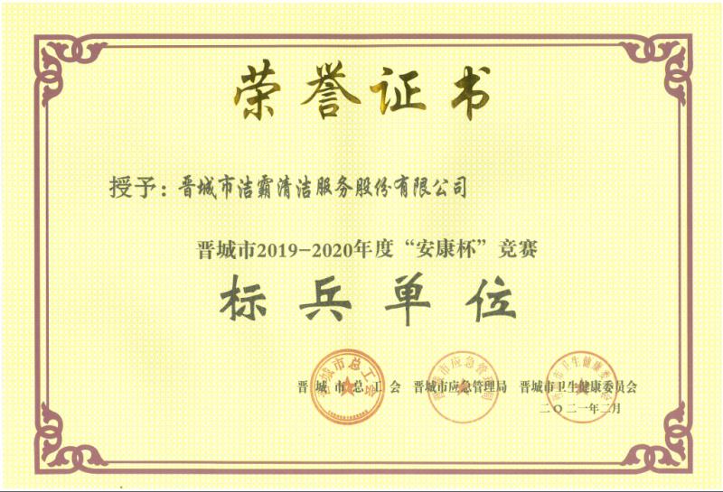 日前,在2019----2020年度全市“安康杯”競賽活動(dòng)中,晉城市潔霸清潔服務(wù)股份有限公司被晉城市總工會(huì)、晉城市應(yīng)急管理局、晉城市衛(wèi)生健康委員會(huì)聯(lián)合授予“安康杯”競賽“標(biāo)兵單位”。