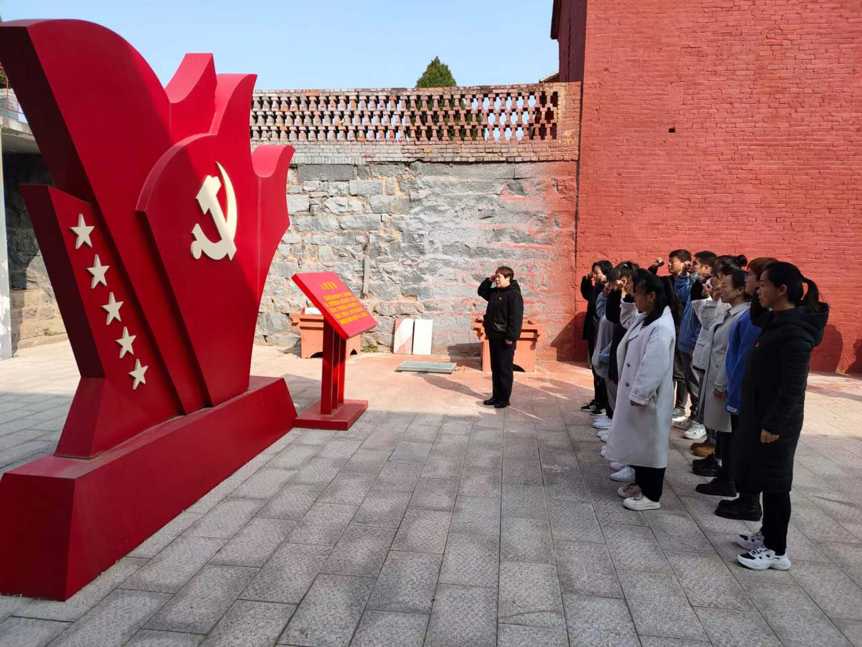 參觀了展覽后,大家站在鮮紅的黨旗雕塑前,莊嚴(yán)地舉起右拳,重溫了入黨誓詞。一聲聲鏗鏘有力的誓言,回響在大院內(nèi),表達(dá)了大家對(duì)黨無(wú)限忠誠(chéng),熱愛黨,永遠(yuǎn)跟黨走的堅(jiān)定決心。
