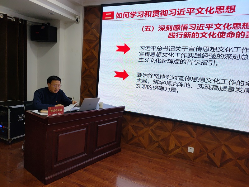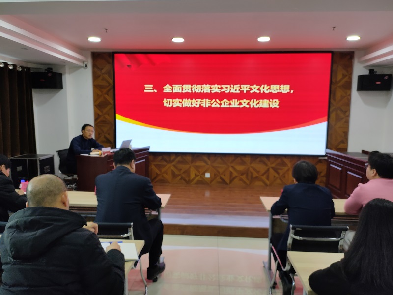 郝天順從習(xí)近平總書記對宣傳思想文化工作作出的重要指示談起,從“如何認(rèn)識和理解習(xí)近平文化思想 ”“如何學(xué)習(xí)和貫徹習(xí)近平文化思想”“全面貫徹落實習(xí)近平文化思想,切實做好非公企業(yè)文化建設(shè)”三個方面進(jìn)行了深刻闡述,指出習(xí)近平文化思想既有文化理論觀點(diǎn)上的創(chuàng)新和突破,又有文化工作布局上的部署要求,明體達(dá)用、體用貫通,明確了新時代文化建設(shè)的路線圖和任務(wù)書,在我國社會主義文化建設(shè)中展現(xiàn)出了強(qiáng)大偉力,為做好新時代新征程宣傳思想文化工作、擔(dān)負(fù)起新的文化使命提供了強(qiáng)大思想武器和科學(xué)行動指南,并結(jié)合非公企業(yè)實際,要求要緊緊圍繞學(xué)習(xí)貫徹習(xí)近平文化思想,圍繞貫徹黨的二十大關(guān)于文化建設(shè)的戰(zhàn)略部署,強(qiáng)化黨建引領(lǐng)作用,帶動企業(yè)文化發(fā)展,將文化建設(shè)作為企業(yè)戰(zhàn)略,不斷創(chuàng)新文化理念,將企業(yè)文化實體化、制度化,促進(jìn)企業(yè)文化升華,推動各項工作落地見效。