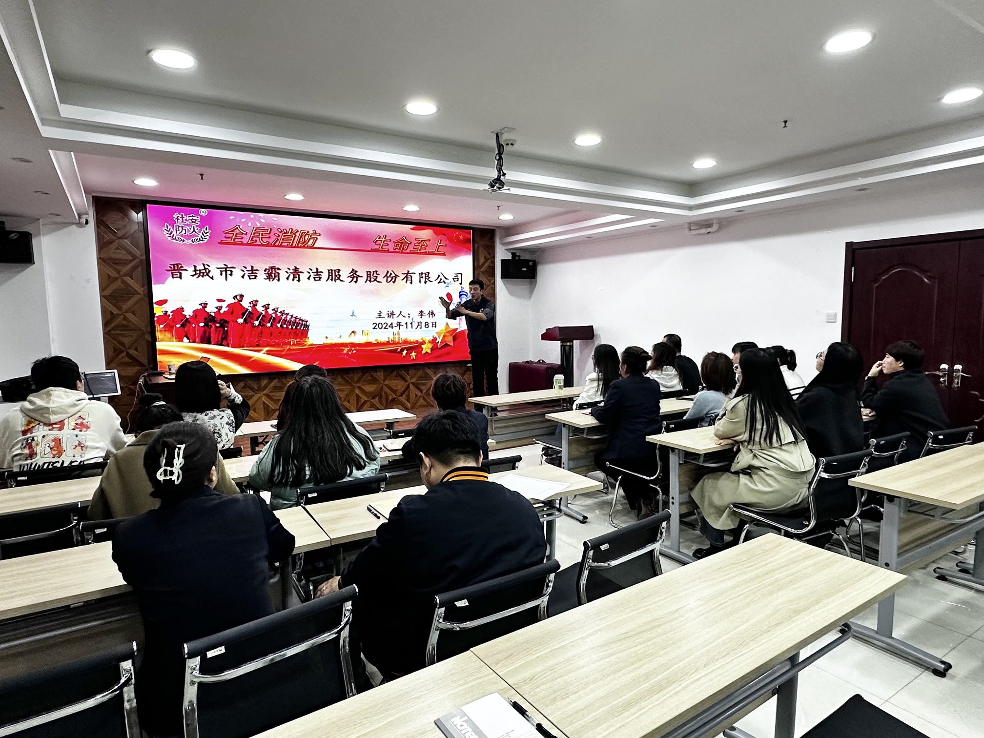 今年11月9日是第33個(gè)“全國消防安全宣傳教育日”。8日晚,公司舉辦“119”消防宣傳月主題培訓(xùn),邀請(qǐng)社安防火的李偉老師進(jìn)行授課。公司近30名管理人員參加培訓(xùn)。
